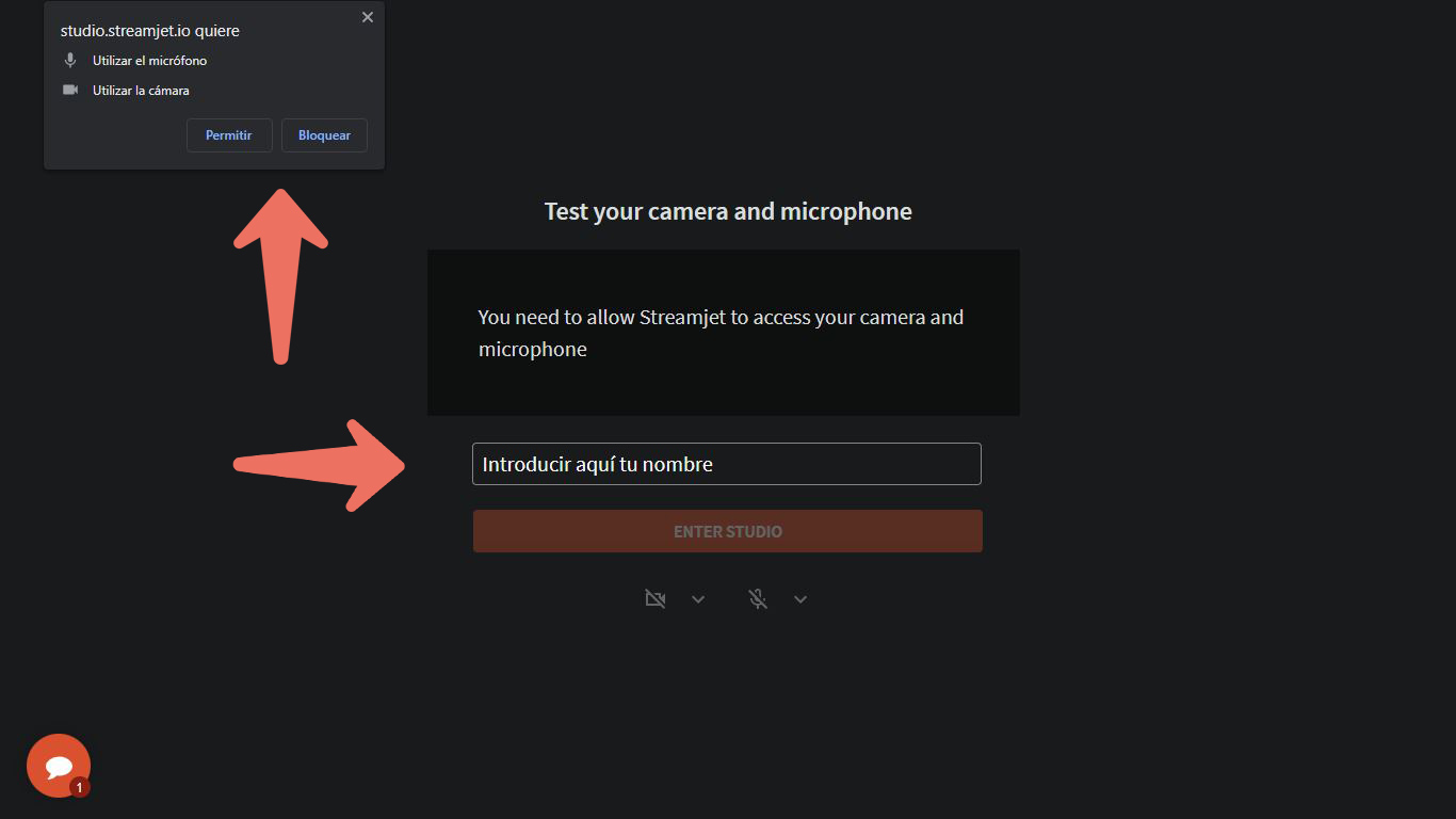 Una vez dentro de Studio, podrás acceder con tu usuario y contraseña. (En caso de que nos aparezca una ventana emergente para permitir el uso de la cámara y el micrófono, hacer clic en Permitir). También podemos introducir el nombre que queramos utilizar durante la emisión.